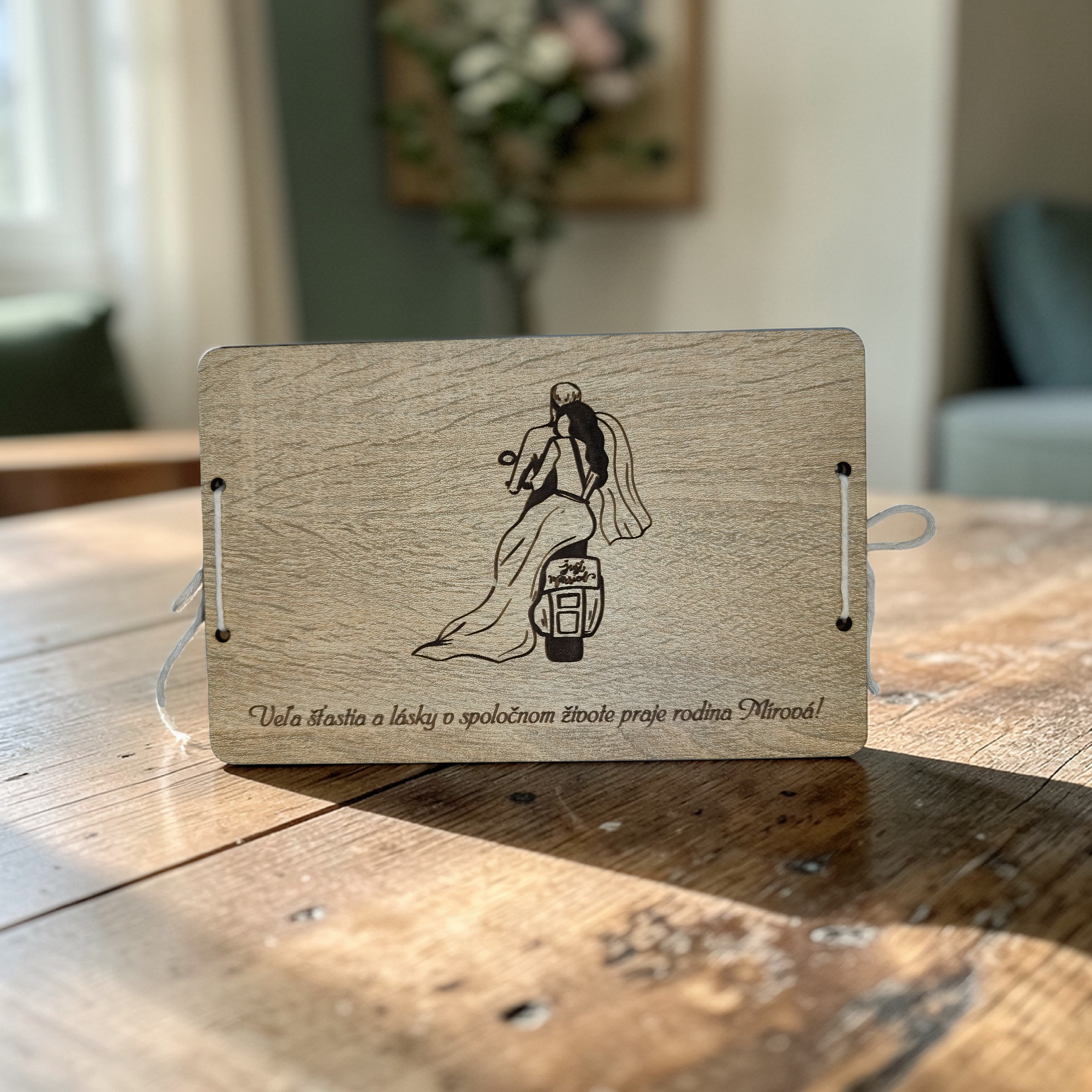 💛 Vyrobené z kvalitného HDF dreva, ktoré zaručuje pevnosť a detailné spracovanie. Precízne laserové gravírovanie vytvára čisté línie a moderný vzhľad. Obálka sa viaže pomocou šnúrky, čo dodáva produktu autentický charakter.