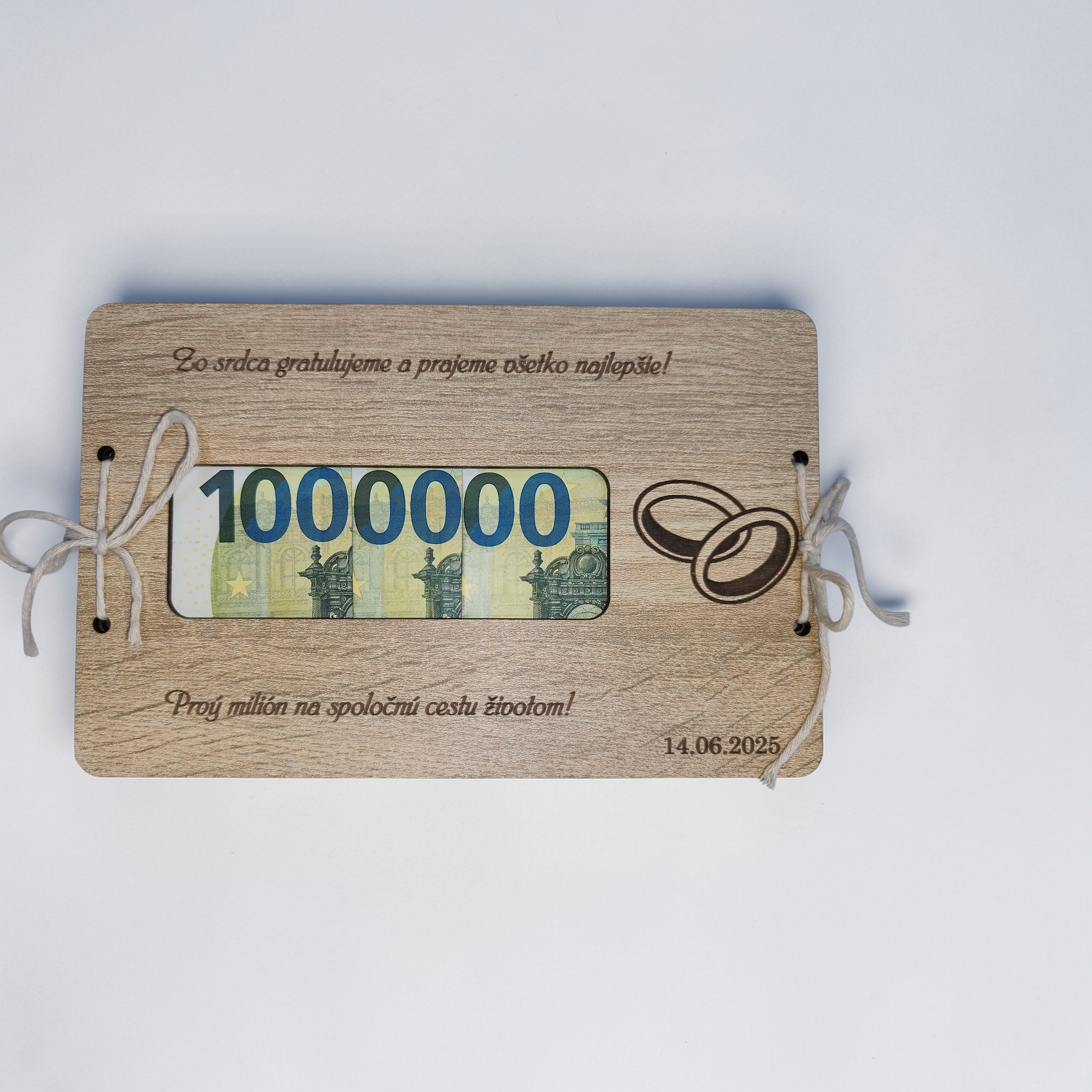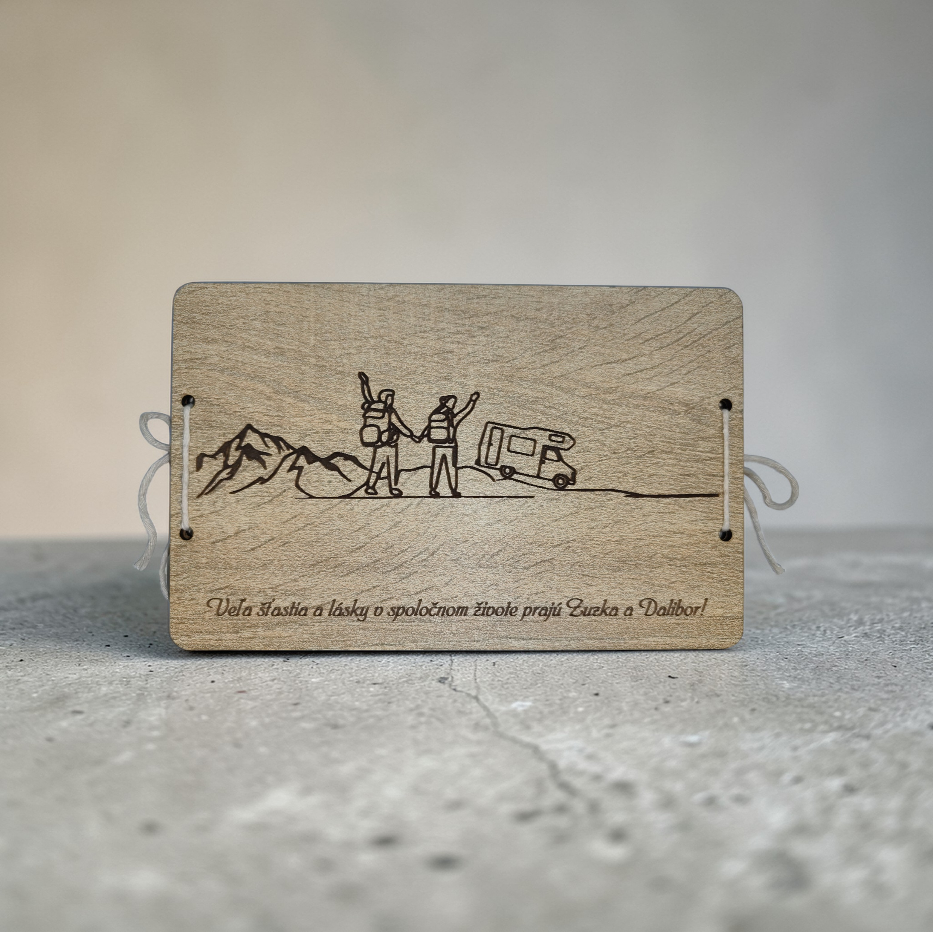 🌿 Predná strana obsahuje elegantný výrez na bankovky s jemným gravírovaním textu, ktorý môžete prispôsobiť. Zadná strana je zdobená detailným motívom hôr, turistov a karavanu – symbolom spoločnej cesty životom. Celok pôsobí veľmi osobne a výnimočne.