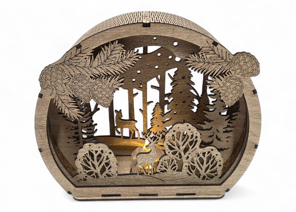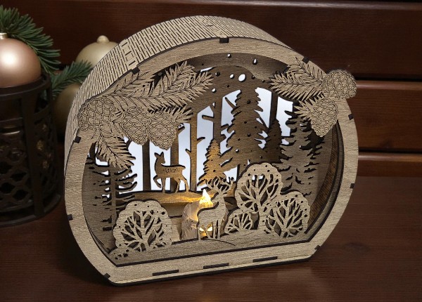 Táto pôsobivá drevená zimná krajina zachytáva pokojné zimné okamihy v hlbokom lese. V popredí stojí jelenček pri svetle lampáša, v pozadí zas prechádza ďalší jeleň medzi stromami. Vrstvený 3D efekt dodáva dekorácii hĺbku a realistickosť, pričom každá vrstva je precízne vyrezaná laserom.