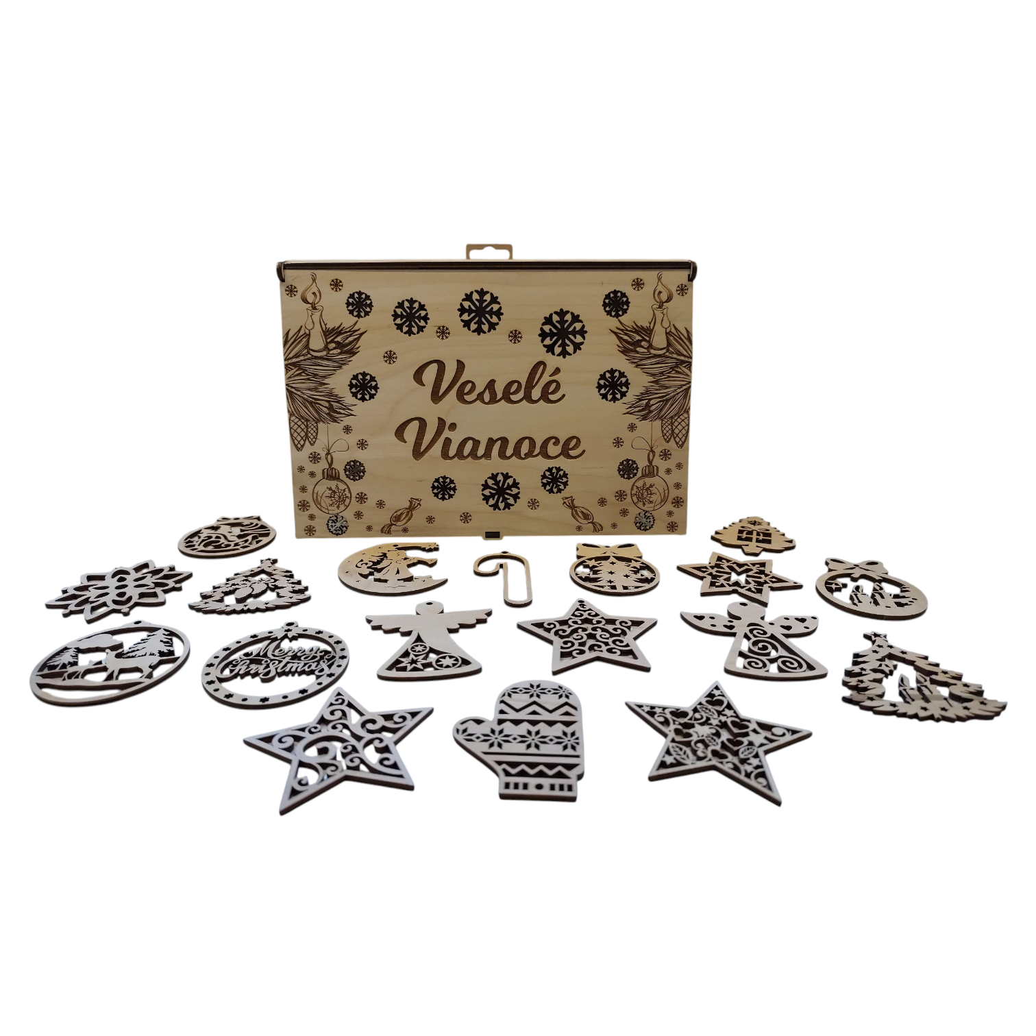 Drevené vianočné ozdoby v darčekovej krabičke – Veselé Vianoce (18 ks)