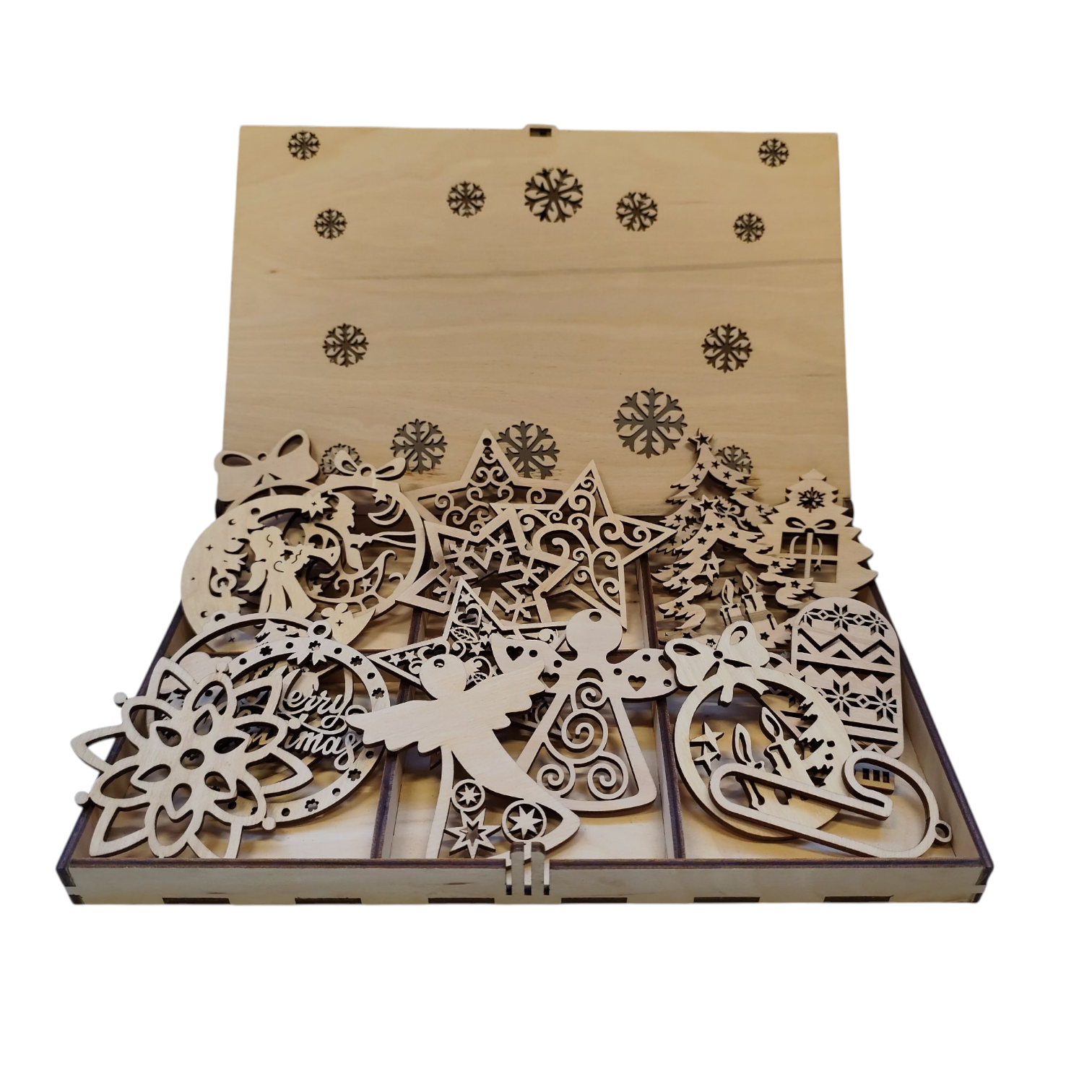 Každá ozdoba je precízne vyrezaná laserom, vďaka čomu má jemné detaily a čisté línie. Ozdoby sú ľahučké, pevné a vhodné na zavesenie na stromček, vence, vetvičky aj do vianočných aranžmánov.