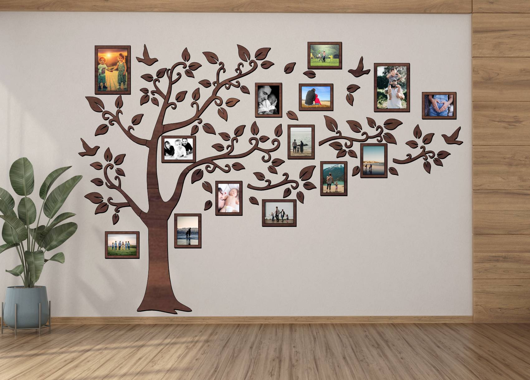 Tento nástenný fotorámik na viac fotiek umožňuje prehľadne vystaviť rodinné portréty, detské momenty aj spoločné zážitky. Fotografie sú rozmiestnené priamo do konárov stromu, vďaka čomu dekorácia pôsobí ľahko, vyvážene a prirodzene zapadne do interiéru.