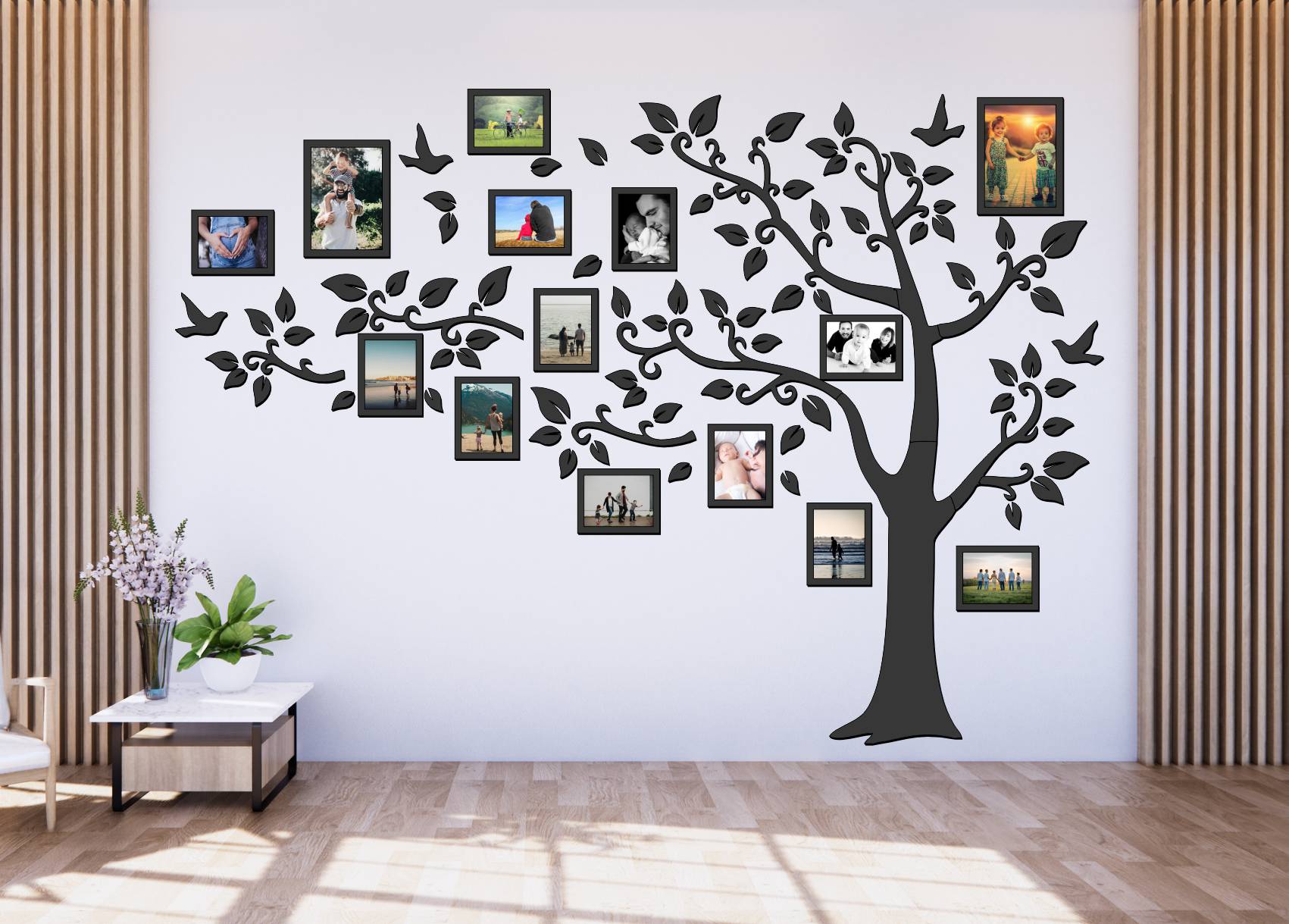 je výrazná rodinná dekorácia, ktorá premení prázdnu stenu na osobnú galériu plnú spomienok. Elegantný strom s bohato tvarovanými vetvami vytvára prirodzený priestor pre fotografie celej rodiny a pôsobí harmonicky, teplo a...