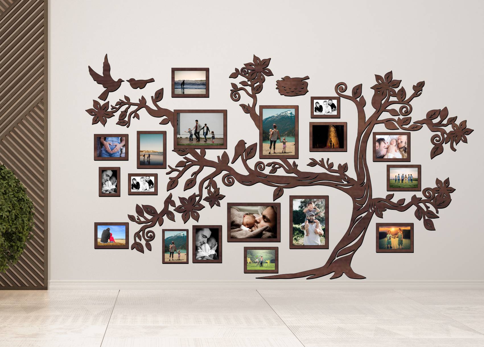 Drevený fotorámik na stenu v tvare rodinného stromu s vtáčikmi a hniezdom je výrazná dekorácia, ktorá vytvorí z vašej steny osobnú galériu rodinných spomienok. Bohato tvarované vetvy, jemné listy, vtáčiky a symbolické hniezdo...