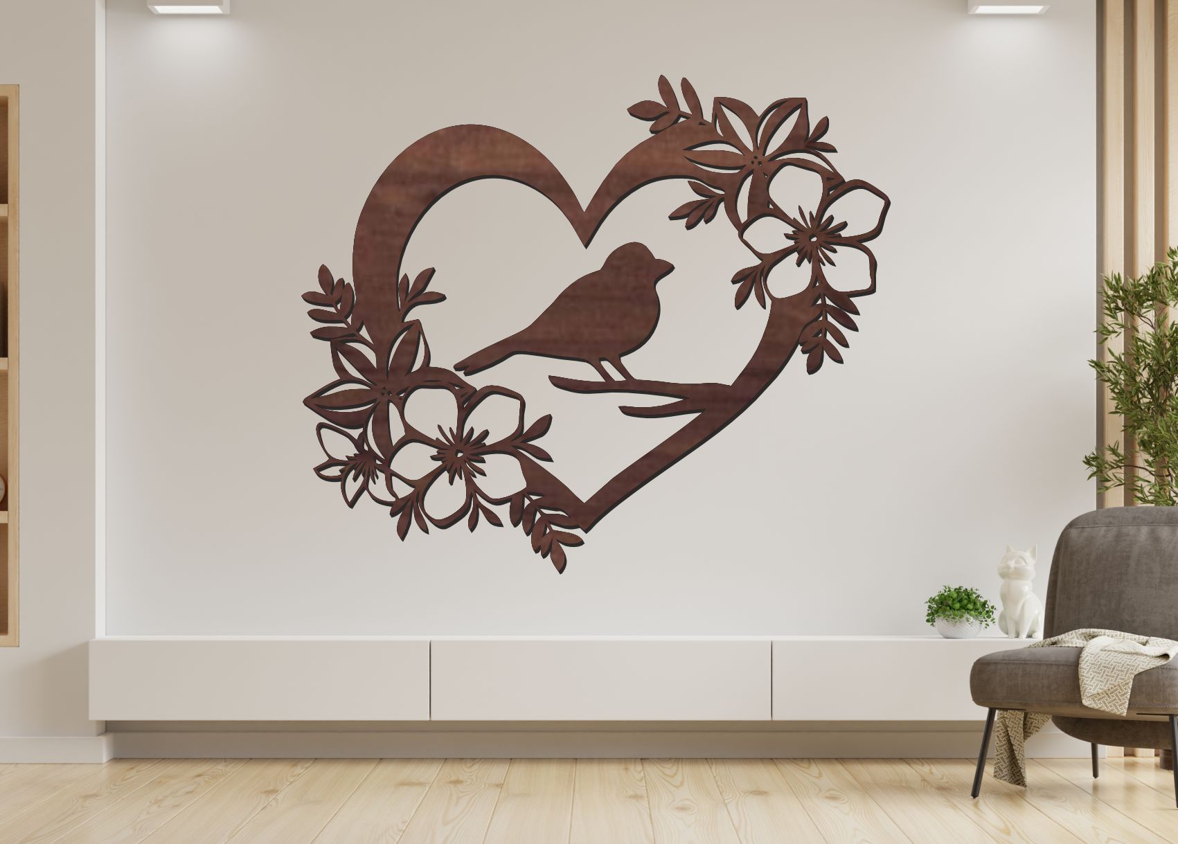 Drevený obraz – Srdce s vtáčikom a kvetmi je nežná, romantická a veľmi elegantná dekorácia vhodná do obývačky, spálne, predsiene aj do chalupárskeho interiéru. Kombinácia jemných kvetov, prírodných línií a malého vtáčika vytvára harmonický a hravý dizajn, ktorý rozžiari každý priestor.