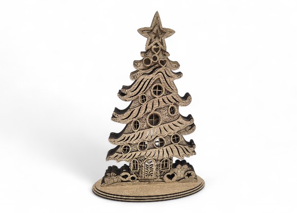 Vďaka precíznej laserovej výrobe sú všetky tvary krásne čisté a výrazné. Stromček stojí na stabilnom oválnom podstavci, takže ho môžeš bez obáv položiť na policu, komodu či ku sviečkam alebo adventnej výzdobe.