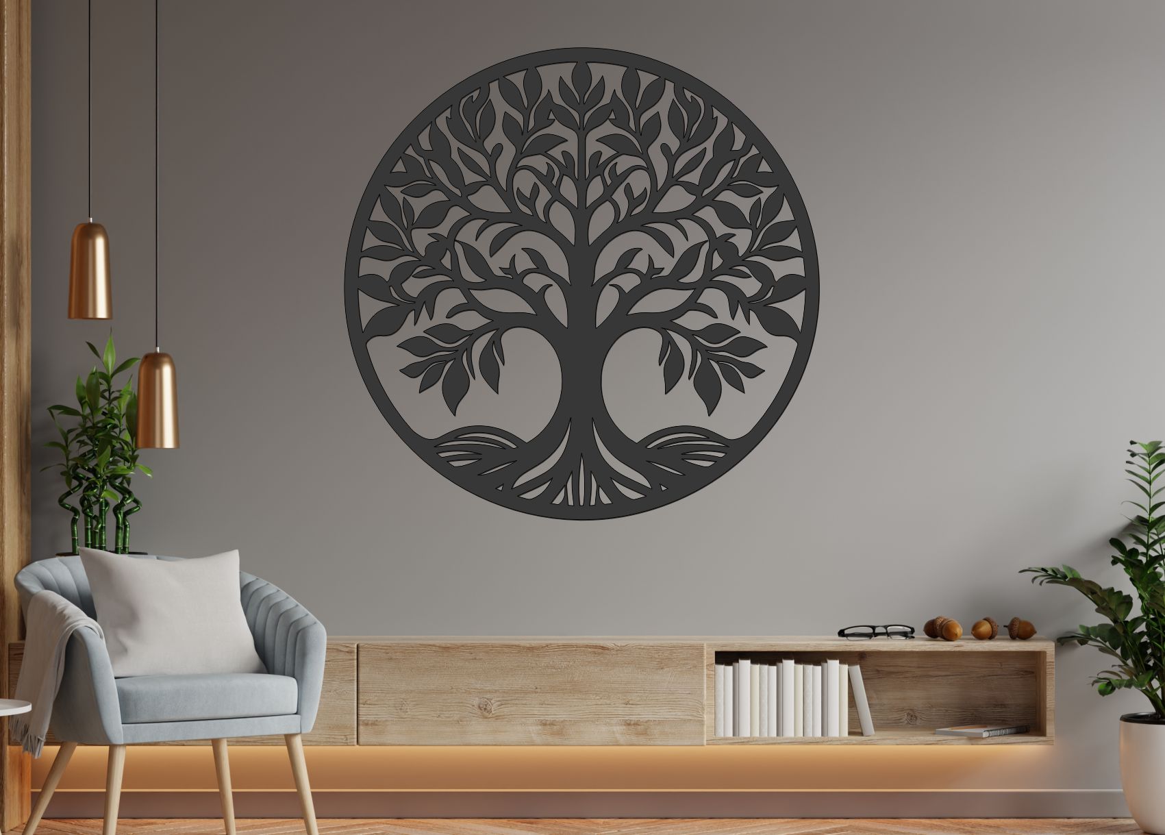 Ak hľadáte dominantný strom zivota, ktorý okamžite pritiahne pozornosť a stane sa hlavným prvkom miestnosti, tento model patrí medzi najpôsobivejšie dizajny. Vynikne v moderných, industriálnych aj nadčasových interiéroch.
