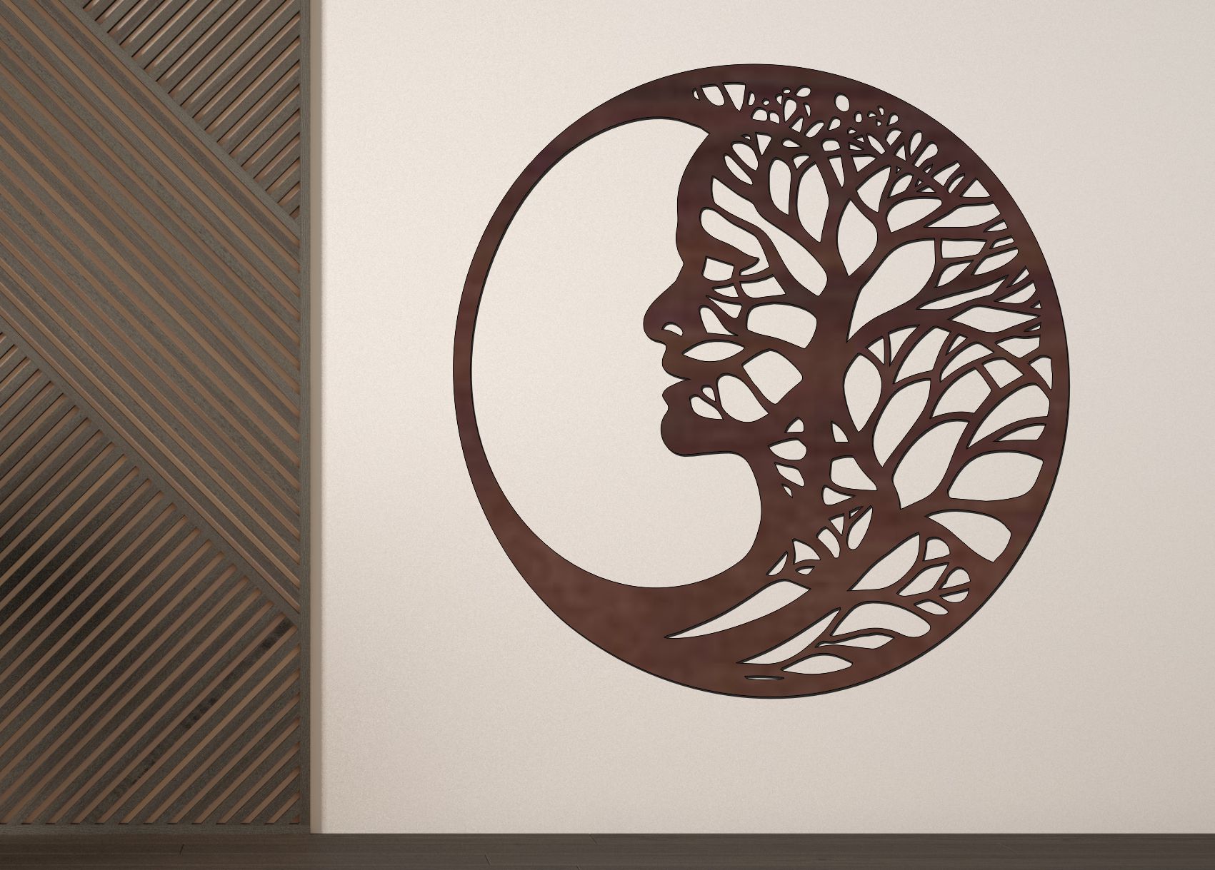 Strom života na stenu Silueta prírody predstavuje moderný a výrazný dizajn, kde sa ženský profil prirodzene prelína s hustou štruktúrou vetiev. Uzavretý kruh vytvára kompaktnú kompozíciu a pôsobí harmonicky aj vo väčších rozmeroch.