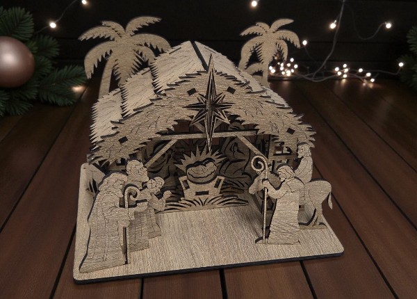 Exkluzívny vyrezávaný drevený betlehem so strieškou – tradičná vianočná dekorácia s jemnými detailmi